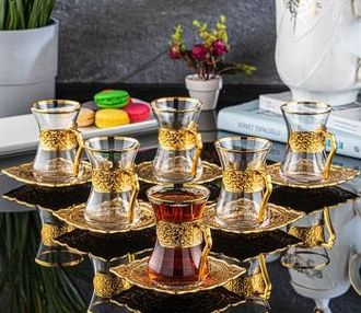 Стаканы для чая (армуды), подарочный набор 6 шт. с блюдцем, декор "золото", Sena, Турция